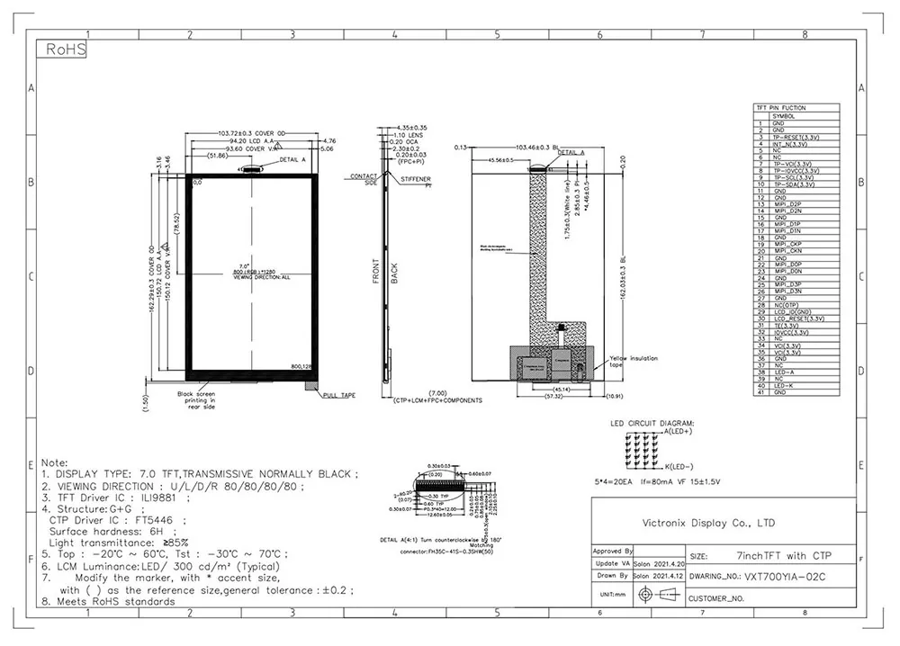 TFT LCD er en type flydende krystalvisning, der bruger tyndfilmtransistorteknologi til at forbedre billedkvaliteten, og den har adskillige anvendelser i hverdagen. Som en professionel TFT -modulproducent og leverandør i Kina, hvad gør Victronix 7 tommer 800 × 1280 MIPI IPS TFT LCD med CTP forskellig fra andre producenter? For det første tilbyder det en typisk lysstyrke på 300 cd/m², 80 ° brede vinkler i alle retninger og et kontrastforhold på 1000: 1, hvilket sikrer fremragende læsbarhed fra forskellige vinkler. For det andet integrerer den en baggrundsbelysningsenhed, der bruger SS4P-LED'er med en typisk levetid på 20.000 til 50.000 timer (til 50% indledende lysstyrke), hvilket sikrer klar synlighed i alle lysforhold. Desuden understøtter det en MIPI -grænseflade med ILI9881 og et kapacitivt berøringspanel med FT5446 -controller. Derudover består det streng miljøvest, inklusive termisk chok (-30 ° C ↔ +80 ° C-cyklusser), fugtighedsopbevaring (60 ° C/90% RH) og mekanisk vibration, hvilket sikrer, at den kan fungere problemfrit på tværs af et udvidet temperaturområde (-20 ° C til +60 ° C).